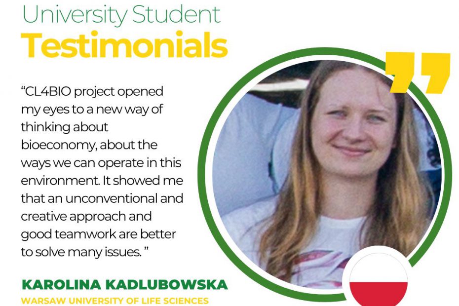 𝗨𝗻𝗶𝘃𝗲𝗿𝘀𝗶𝘁𝘆 𝗦𝘁𝘂𝗱𝗲𝗻𝘁 𝗧𝗲𝘀𝘁𝗶𝗺𝗼𝗻𝗶𝗮𝗹𝘀 “CL4BIO project opened my eyes to a new way of thinking about bioeconomy, about the ways we can operate in this environment. It showed me that an unconventional and creative approach and good teamwork are better to… Read More »Karolina Kadlubowska, student from Warsaw University of Life Sciences, Poland