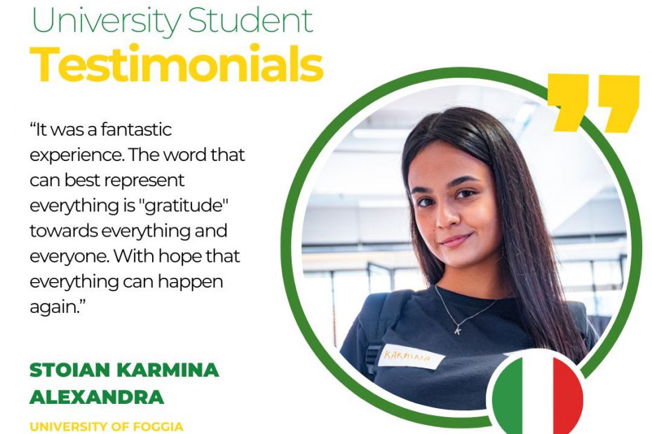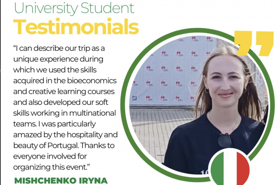 𝗨𝗻𝗶𝘃𝗲𝗿𝘀𝗶𝘁𝘆 𝗦𝘁𝘂𝗱𝗲𝗻𝘁 𝗧𝗲𝘀𝘁𝗶𝗺𝗼𝗻𝗶𝗮𝗹𝘀“I can describe our trip as a unique experience during which we used the skills acquired in the bioeconomics and creative learning courses and also developed our soft skills working in multinational teams. I was particularly amazed by… Read More »Mishchenko Iryna, Student from University of Foggia, Italy
